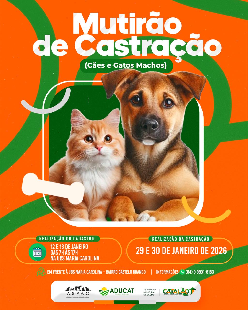 A cidade de Catalão recebe, nos dias 29 e 30 de janeiro de 2026, um Mutirão de Castração de Cães e Gatos Machos, iniciativa voltada ao controle populacional de animais e à promoção da saúde pública e do bem-estar animal.
