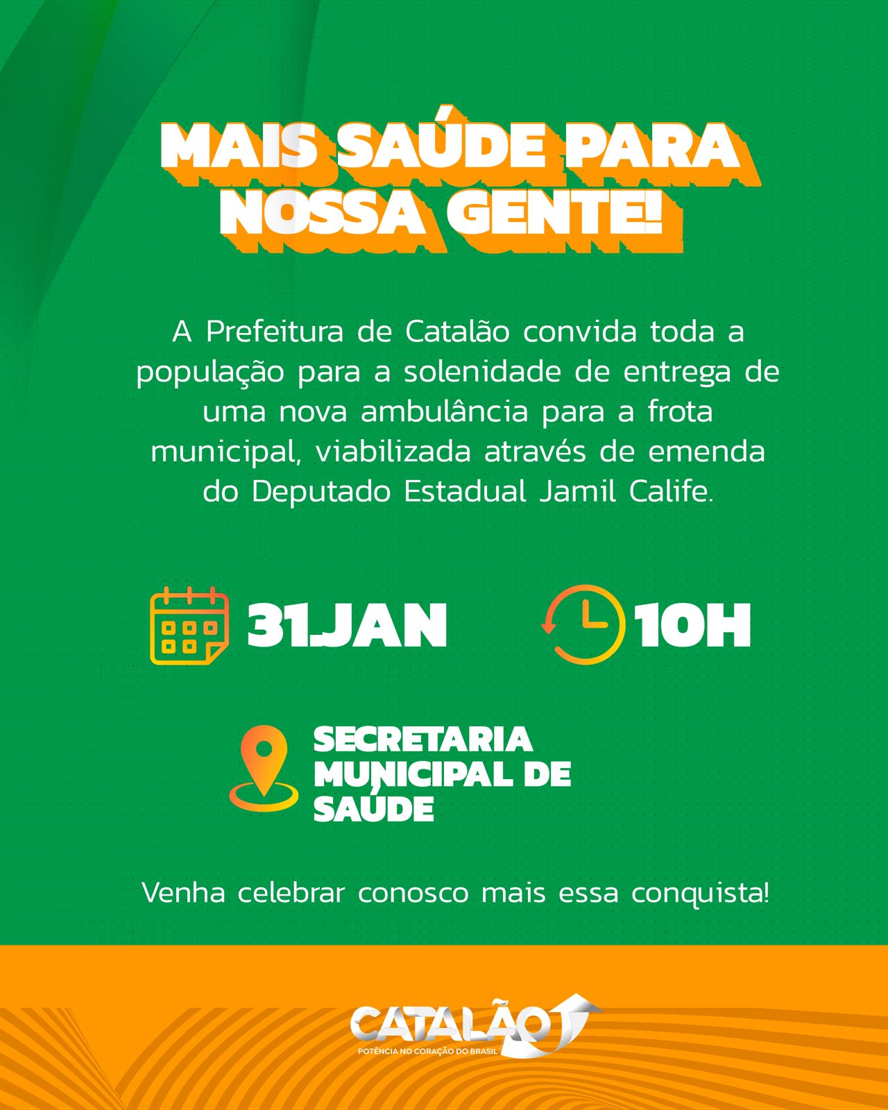 A Prefeitura de Catalão convida a população para a solenidade de entrega de uma nova ambulância que passará a integrar a frota municipal de saúde. O evento será realizado no dia 31 de janeiro, às 10h, na Secretaria Municipal de Saúde.